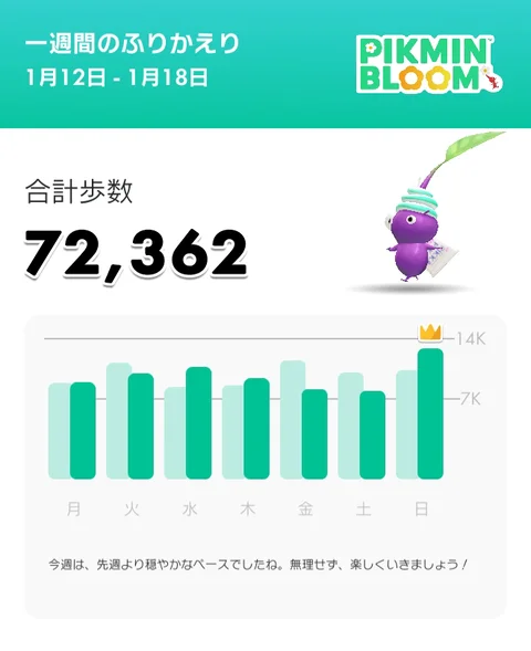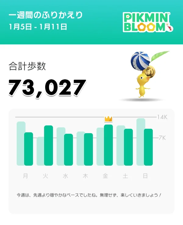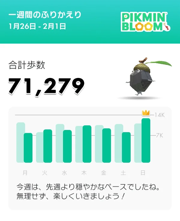 Weekly goal (70,000 steps) met again; aiming for 80,000 steps this week.